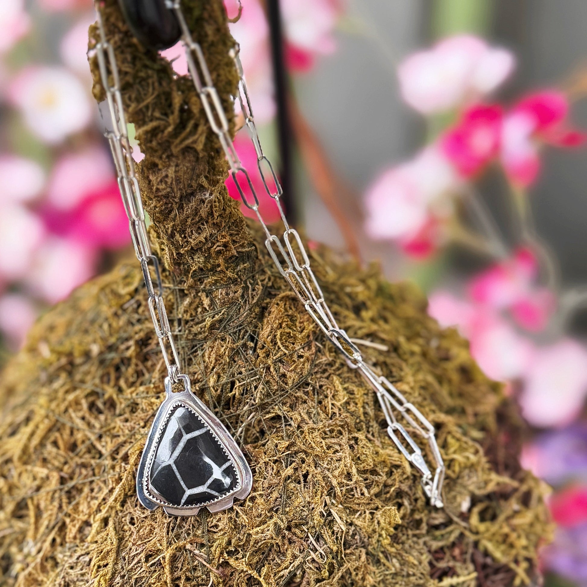 This pendant features black septarian stone — a rare, naturally occurring stone formed millions of years ago when volcanic activity and mineral-rich sediment created pockets of calcite, aragonite, and limestone. These nodules eventually cracked and hardened into the distinctive patterns seen today. This particular stone was sourced from Utah, one of the few places where black septarian is found.