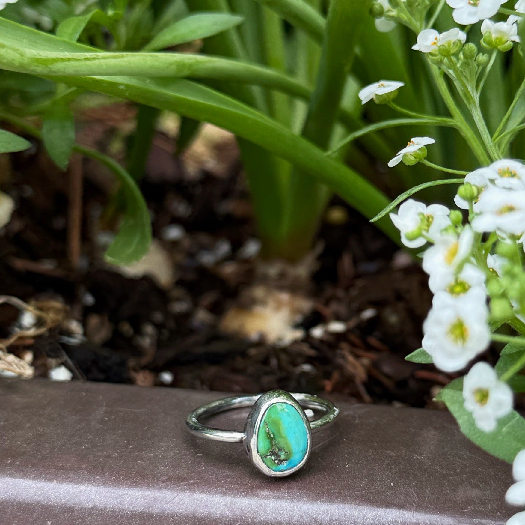 This handmade ring features a small but vibrantly colored Sonoran Gold turquoise stone, sourced directly from the Otteson Brothers at the gem show in Santa Fe, New Mexico. Set in fine and sterling silver with a slim band, it’s designed to wear solo or stack with others. Size 6.75